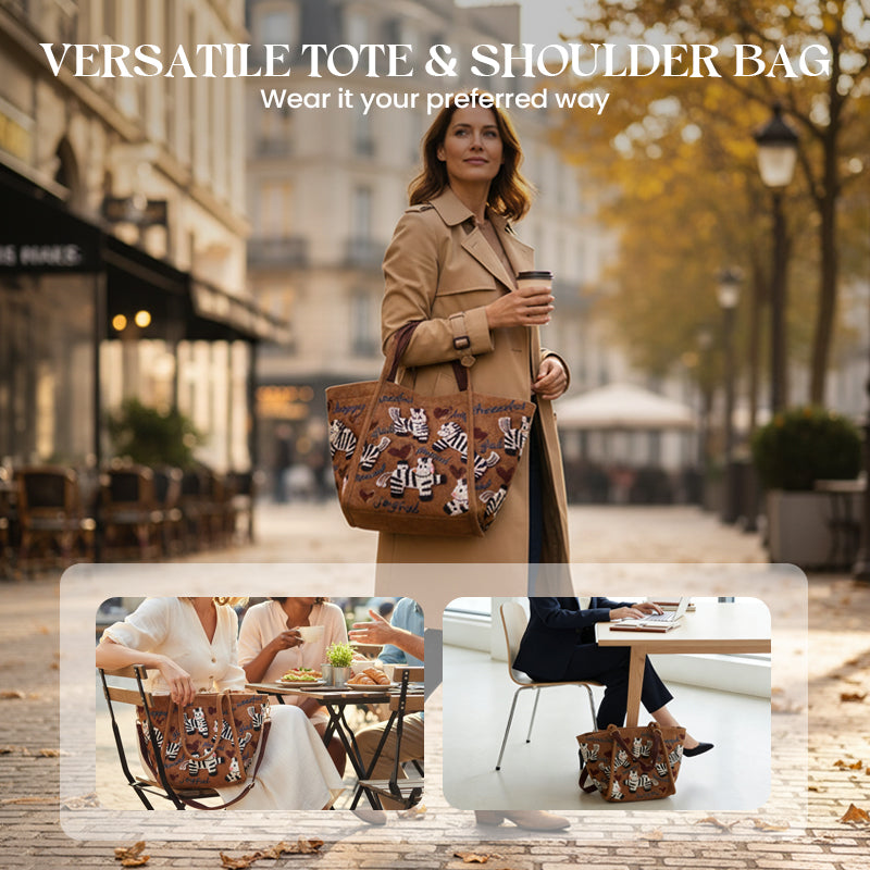 WHIMSICAL ZEBRA EMBROIDERY - The playful embroidered zebras and cheerful words add a unique, artistic touch to your daily look, expressing a joyful and positive personality through your accessory choice.